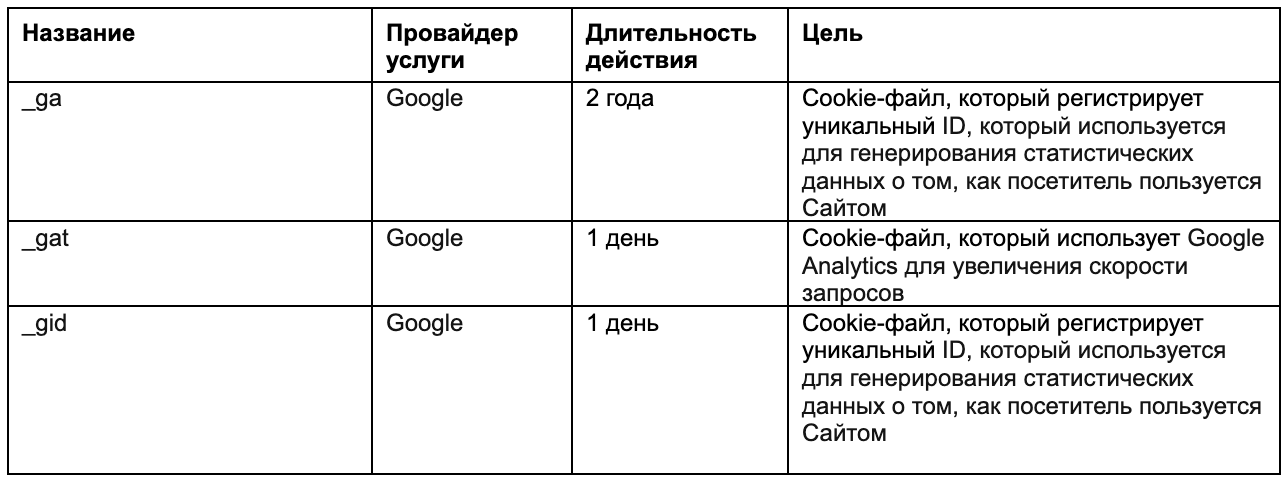4.2.2. “постоянные”: эти cookie-файлы не удаляются после закрытия окна браузера и сохраняются на устройстве пользователя на определенное время после завершения сессии просмотра Сайта. Эти cookie-файлы позволяют запоминать ваши настройки или действия на Сайте и применять их в следующий раз, когда вы посетите Сайт. В течение срока их действия эти cookie-файлы активизируются каждый раз, когда вы посещаете Сайт.