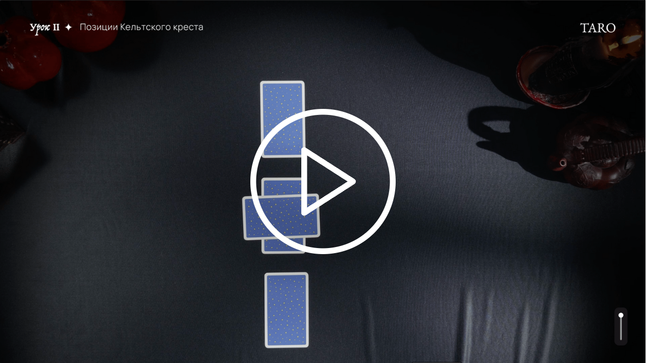 In this lesson, we will explain the positions of the spread “Celtic Cross”, especially emphasizing the meaningful pairs. We will tell you about the nuances of performing this spread. You will see how the card is changing its meaning depending on the position of it in the spread. We will also talk about how to correctly word the question and to combine the energy of the question and the energy of the cards.